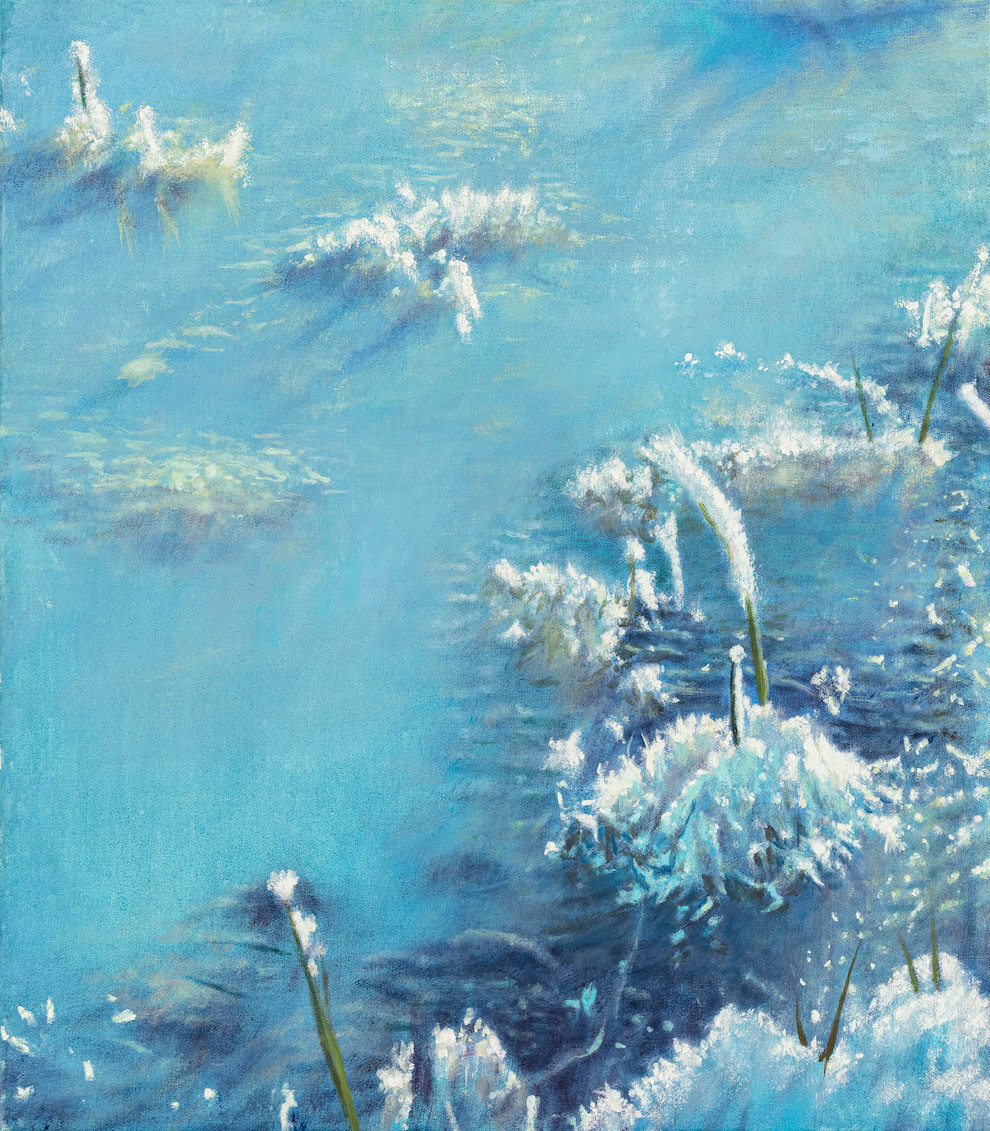 Die großformatigen Bilder überraschen mit einem außergewöhnlichen Effekt, die einer speziellen Auftragstechnik geschuldet sind: Mehrere Schichten Kunstharz, die mit Acryl- und Ölfarben, Aquarellkreiden, Wachsmalstiften und Bleistift überarbeitet werden und somit die Bilder in einer "3D"-Optik erscheinen lassen.