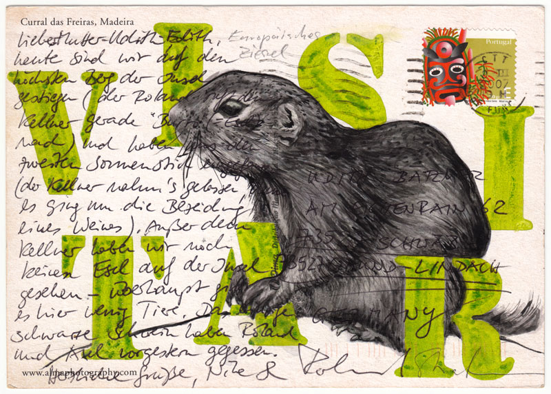 Zeichentusche auf gelaufener Postkarte aus Portugal