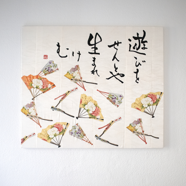 Wir sind zum Spielen geboren. (Der Ryōjin Hishō) / We are born to play. (The Ryōjin Hishō) Seidenkimono mit Kalligraphie-Applikationen 128 x 110 cm 2023 Preis auf Anfrage |
